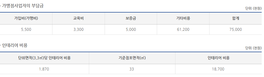 인테리어 비용은 평당 187만원, 기준점포면적은 10평입니다.