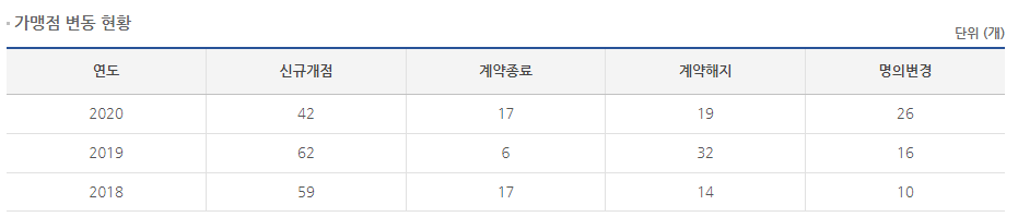 2020년 신규개점 42개 계약종료 17개, 계약해지 19개입니다.