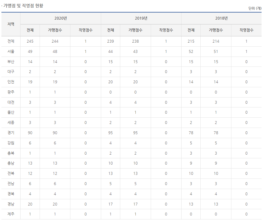 244개가 가맹점이며 직영점은 1개 운영하고 있습니다.