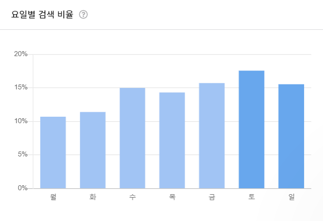 요일별 검색비율은 토요일이 가장 검색비율이 일주일 중에 높습니다.