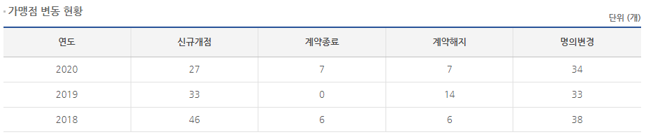 2020년 신규개점은 27개, 계약종료 7개, 계약해지 7개