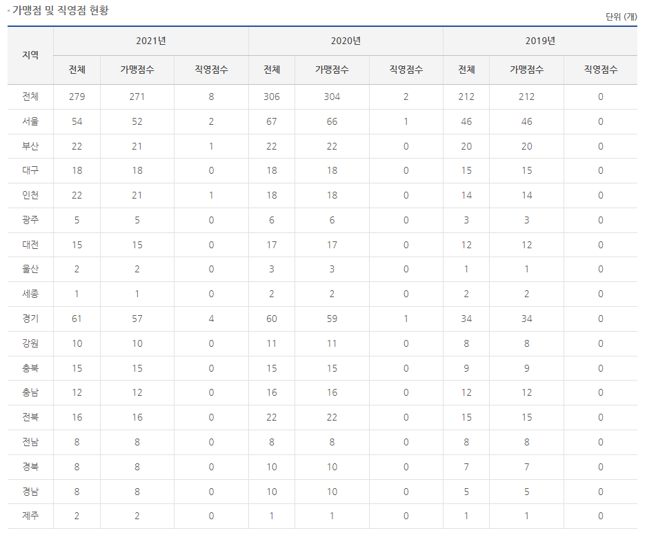 2021년 기준 전국에 279개의 매장이 있으며