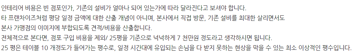 25평 기준으로 창업 비용은 넉넉하게 7000만원 선이라고 합니다.