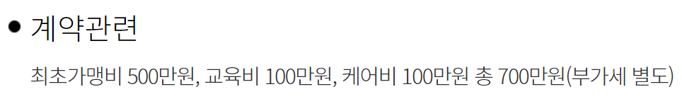 가맹비는 500만원 교육비는 100만원입니다. 거기에 케어비라고 있네요 100만원입니다.