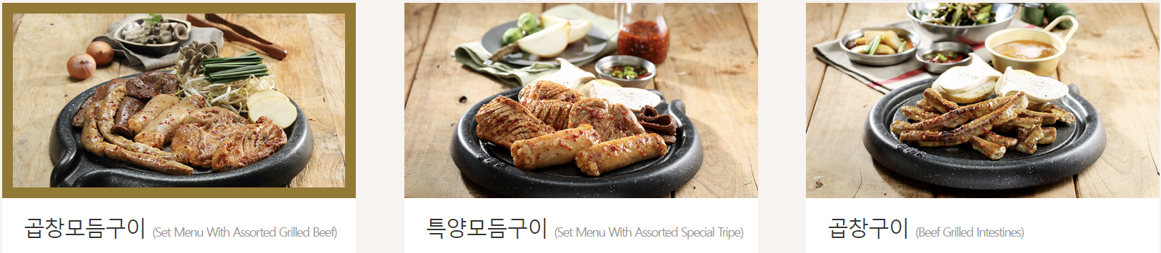 곱창모듬구이, 특양모듬구이, 곱창구이 메뉴가 있습니다.