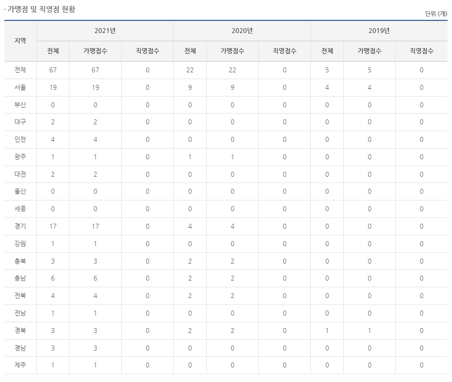 신규개점이 2021년 전년대비 많이 늘어났습니다.