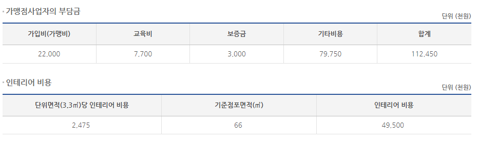 가맹비는 2200만원입니다. 홈페이지 1500만원이라고 나와있으니 차이가 있습니다.