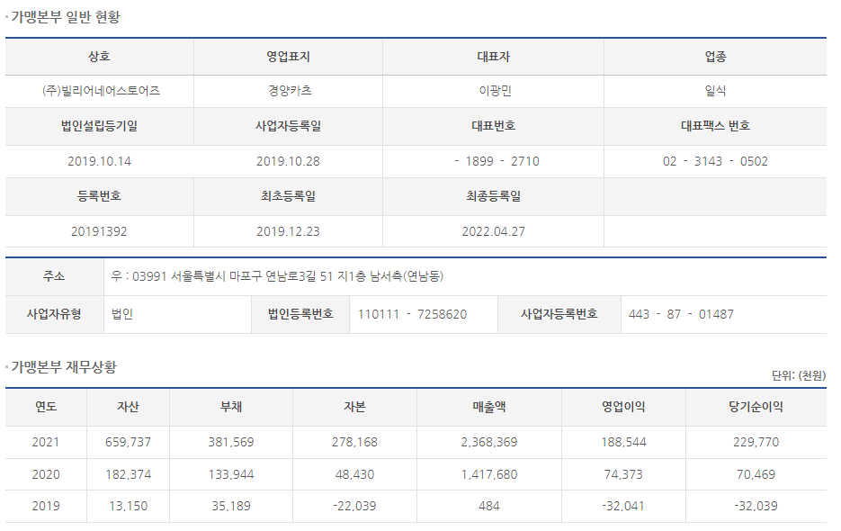 홈페이지와 공정위 정보공개서를 통해 알아보았습니다.