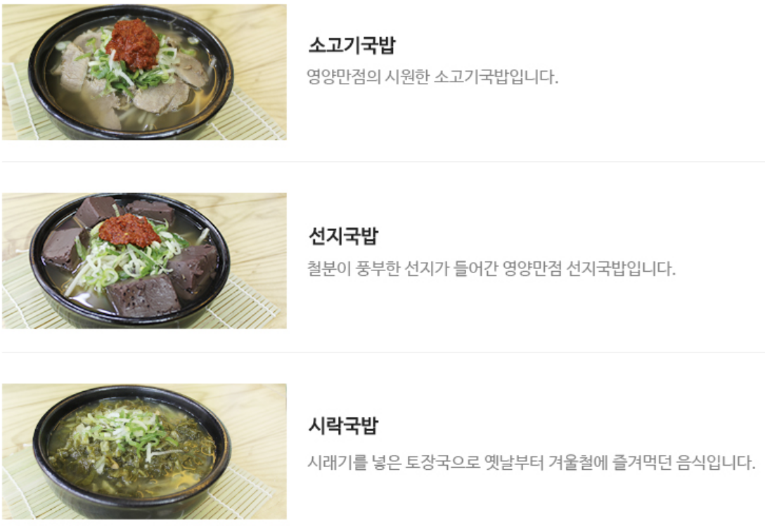 소고기국밥, 선지국밥, 시락국밥이 밥 메뉴로 있습니다.