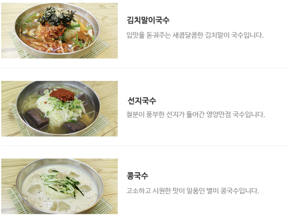 김치말이국수, 선지국수, 콩국수등 국수 메뉴등이 있습니다.