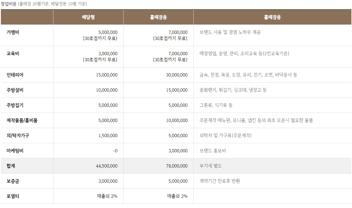 배달형은 4450만원이 필요하며 30호점까지 가맹비 교육비가 무료이며 보증금 300만원이 있기 때문에.