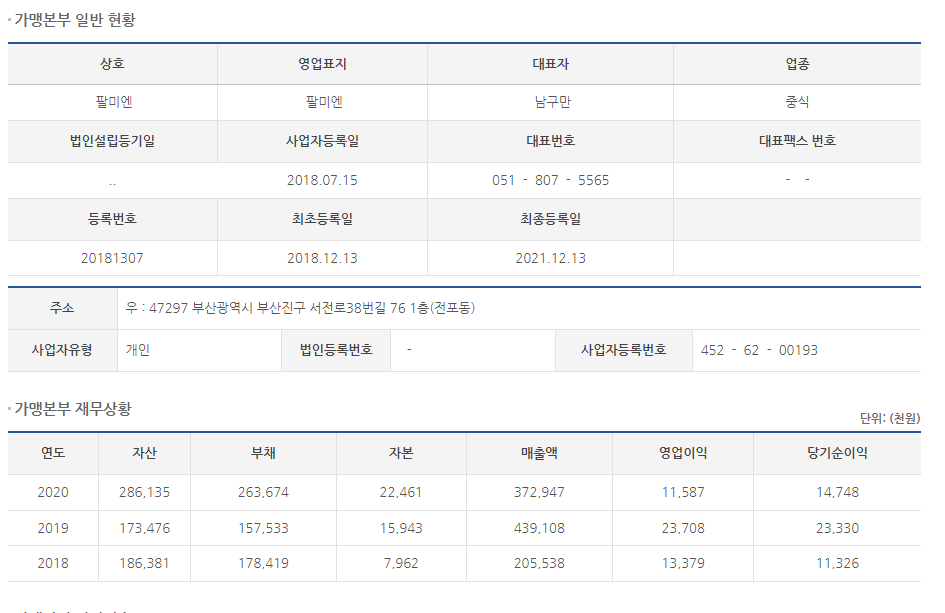 홈페이지를 통해 팔미엔을 알아보았으니 공정위 정보공개서를 통해 알아보겠습니다.