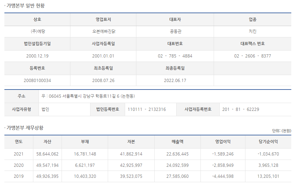 주식회사 에땅에서 오븐에빠진닭을 운영하고 있습니다.