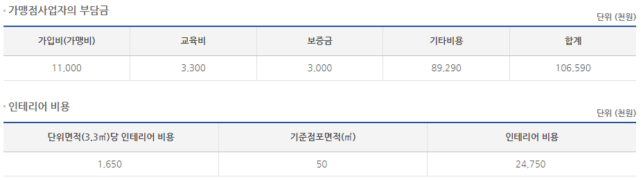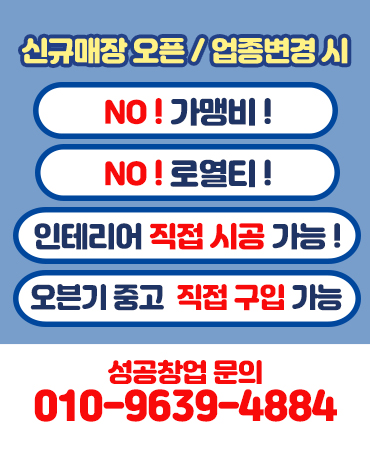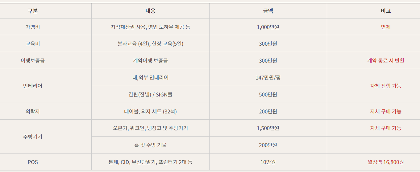 하지만 현재 가맹비 없습니다. 그 외에 인테리어 의탁자 주방기기 자체 구매 및 시공 가능합니다.
