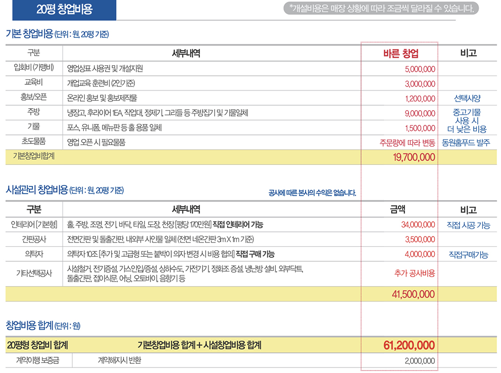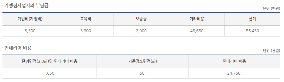 인테리어 비용은 평당 165만원이며 기준점포 면적은 15평입니다.