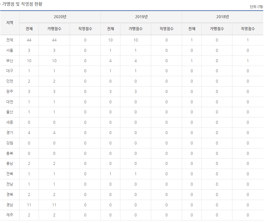 홈페이지와 공정위 정보공개서를 통해 알아봤습니다.